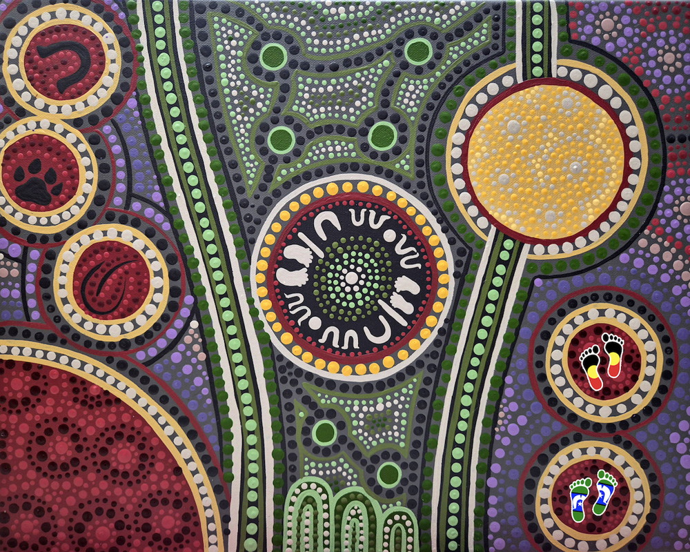 The artwork highlights the shared journey and the unity of cultures coming together, symbolised by the tracks – not only as literal pathways but also as a metaphor for the journey that has led to this moment of meeting and reconciliation.