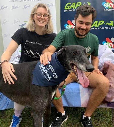 Delighted new owners Rhiannon Perrin and Jackson Morley (pictured) secured Monty through the Greyhound Adoption Program (GAP).