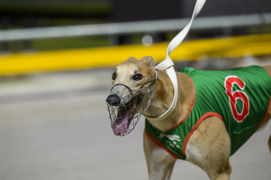 The dog showed good strength to hold his line in third place from the four box at the first turn.